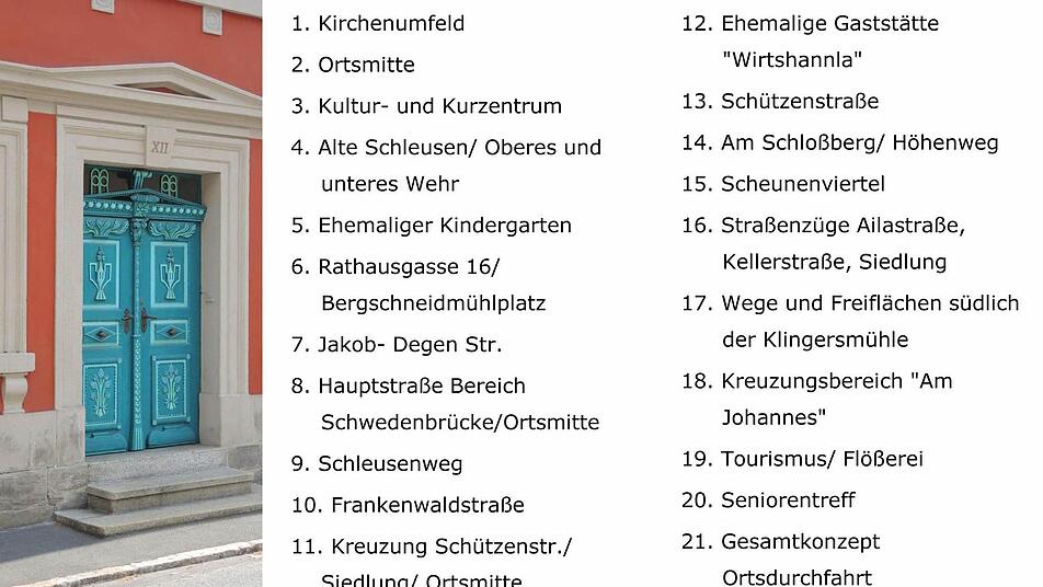21 Maßnahmen wurden von den Fachleuten im Zuge der Stadtsanierung in Wallenfels vorgeschlagen. Die Bürger und die Stadträte entschieden sich für folgende Prioritätenliste: