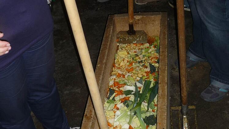 Auch die Jugend hilft mit Das Gemüse kommt vom Fruchthof in Stadtsteinach. Die Zubereitung ist aufwendig und ein geselliges Event, bei dem auch die Jugend gerne mithilft. Rüben, Möhren, Lauch, Wirsing und Weißkohl wurden gewaschen und sauber geputzt. Dann walten die Freiwilligen ihres Amtes und stopfen das Gemüse. In Holztrögen, die noch von anno dazumal vorhanden sind, wird alles mit Spezialwerkzeugen zerkleinert. "Das sind so Messer, so ähnlich wie die, mit denen früher auch die Bäume geschält worden sind", erklärt Eger. Einige Werkzeuge stammen noch aus Großvaters Zeiten, andere wurden repariert und nachgebaut. "Je kleiner das Gemüse ist, desto besser. Denn dann gärt es leichter", erklärt Eger die Details.