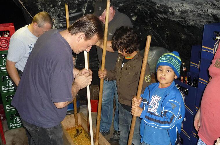 Natürlich muss das Gemüse dann noch kräftig eingesalzen werden. Und wenn alles gut vermischt ist und ordentlich eingesalzen ist, dann wird es aus den Holzgefäßen herausgeschüttet und in Plastikfässer gestampft. "Das muss vor sich hingären. Wir lagern das Gemüse im Felsenkeller und beschweren die Fässer", erklärt Eger. Früher wurde in Steingut vergoren, inzwischen werden allerdings Plastikfässer verwendet.