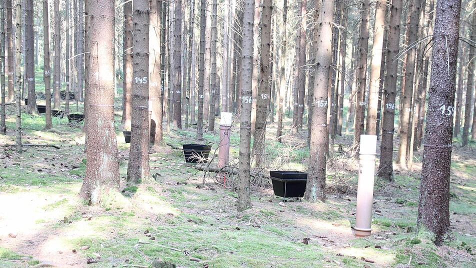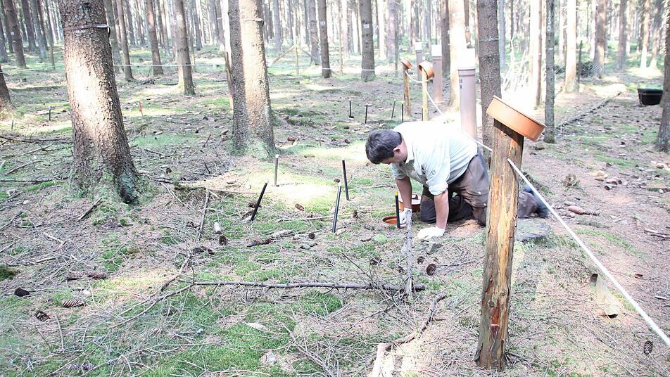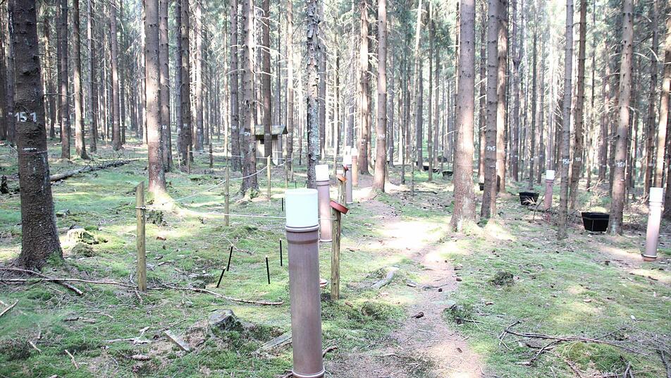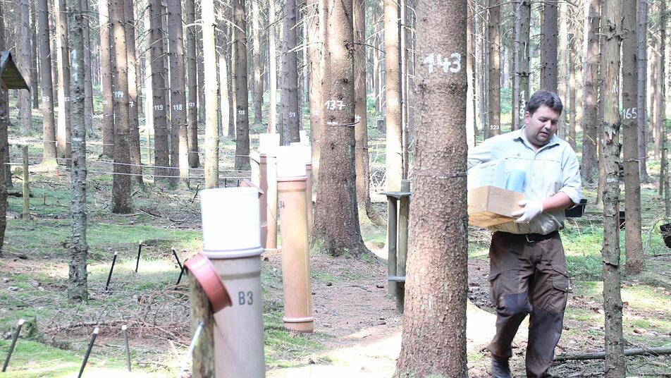 Schon wieder nichts drin. Marcus Hollederer dreht das Auffanggefäß für das Regenwasser um, doch es tropft nichts heraus. Einmal pro Woche entnimmt der Forstwirtschaftsmeister Proben in der Waldklimastation der Landesanstalt für Wald und Forstwirtschaft (LWF). Die ist in einer Freifläche auf einer Wiese in der Nähe des ehemaligen Waldhauses Waidmannsheil sowie ein bisschen entfernt davon im Wald eingerichtet.