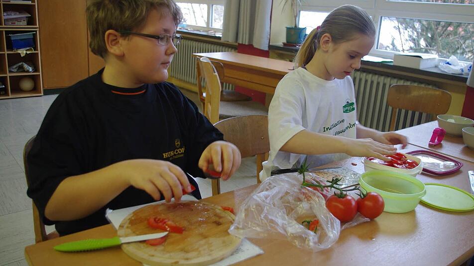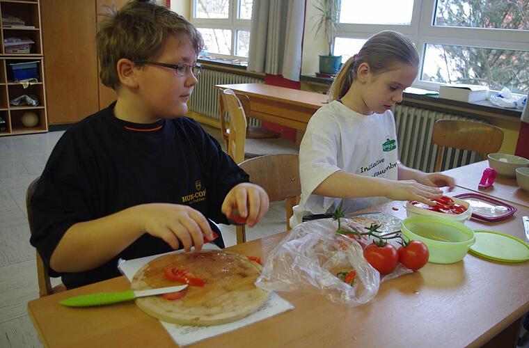 Yannick und Vesa sind am Morgen schon fleißig. Vesa schält mit einem Gemüseschäler Salatgurken, bevor sie und ihr Banknachbar diese anschließend in Scheiben schneiden. Aber nicht nur sie sind eifrig bei der Arbeit: Im gesamten Klassenzimmer der vierten Jahrgangsstufe herrscht bereits um 8 Uhr Hochbetrieb. Eine Bank hinter ihnen zerpflücken David und Fiona einen Kopf Eisbergsalat, während ganz hinten in der Reihe Celine und Jonas Tomaten schnippeln.
