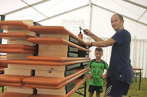 Auf der Wiese gegenüber der ehemaligen Hesselbacher Schule geht es an diesem Samstagmittag rund. Das Festzelt für das 26. Hesselbacher Dorffest steht bereits. Rund drei Stunden haben die circa 20 Helfer für den Aufbau gebraucht, nun geht es an die letzten Arbeiten - wie beispielsweise die Bestuhlung. Bevor die von der Dorfgemeinschaft Hesselbach neu angeschafften Biertischgarnituren aufgestellt werden, werden diese erst einmal gebrandmarkt. Alexander Kittel brennt mit einem Gasbrenner die Kürzel DG ein. Bei der Bestuhlung hilft auch sein Sohn mit, der neunjährige Benjamin. Auf dem Vorplatz vor der ehemaligen Schule tut sich einiges: Der kleine Aaron - noch nicht einmal vier Jahre alt - hilft seinem Papa Ralf Welsch wie auch Matthias Eidloth beim Kabelausrollen.
