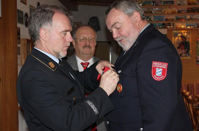 Helmut Opel wurde bei der Feuerwehr Ebersdorf sowohl für 40 Jahre Zugehörigkeit als auch für 40 Jahre Dienstzeit mit dem goldenen Feuerwehrehrenzeichen durch den weiteren Stellvertreter des Landrats Bernd Steger (FW) und Kreisbrandrat Joachim Ranzenberger geehrt.