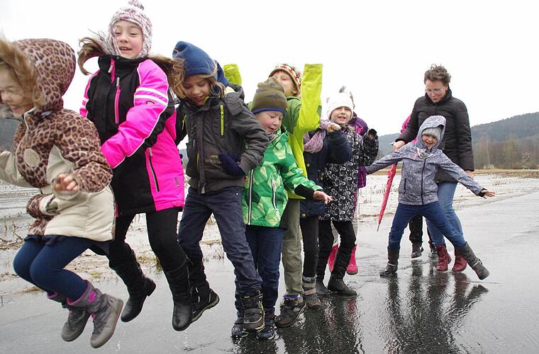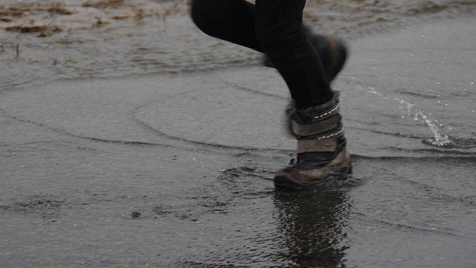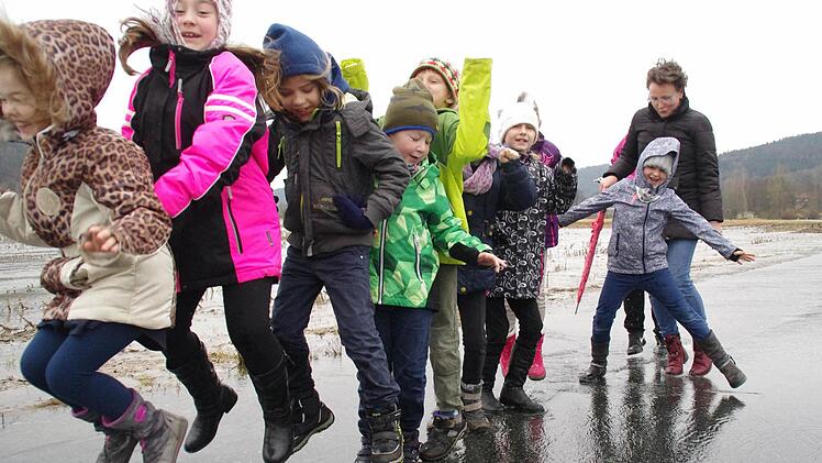 Zwei Dutzend Beine holen Schwung, springen in die Höhe, und es macht platsch! Die Schüler der Montessori-Schule Mitwitz haben auf der überschwemmten Straße ihren Spaß. Und dabei lernen sie noch. "Die Phänomene des Wassers stehen auf dem Lehrplan", erklärt Manja Kämpf, die gemeinsam mit den Kindern am sicheren Rand des Hochwasserbereichs experimentiert. Drei Kilometer weiter wecken die Wassermassen der Steinach weniger Freude. Auf der Staatsstraße 2208 zwischen Mitwitz und Wörlsdorf macht ein Auto nach dem anderen kehrt. Gerade wurden Sperrschilder aufgestellt.