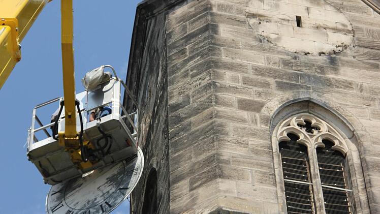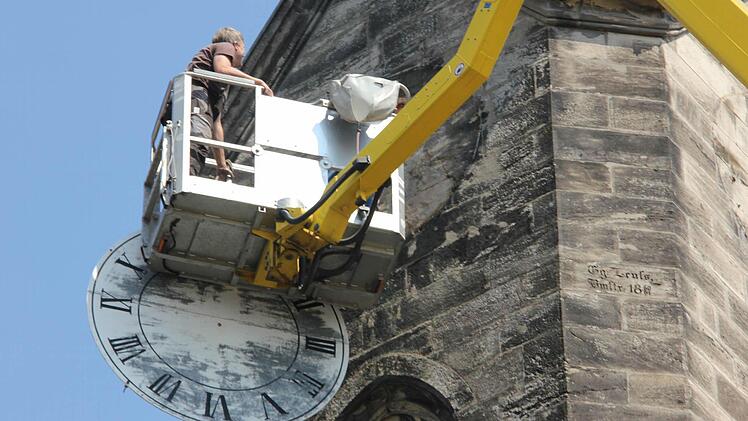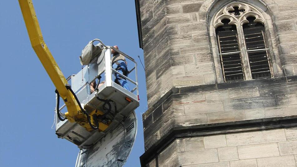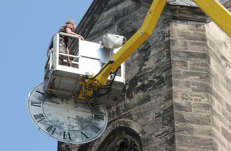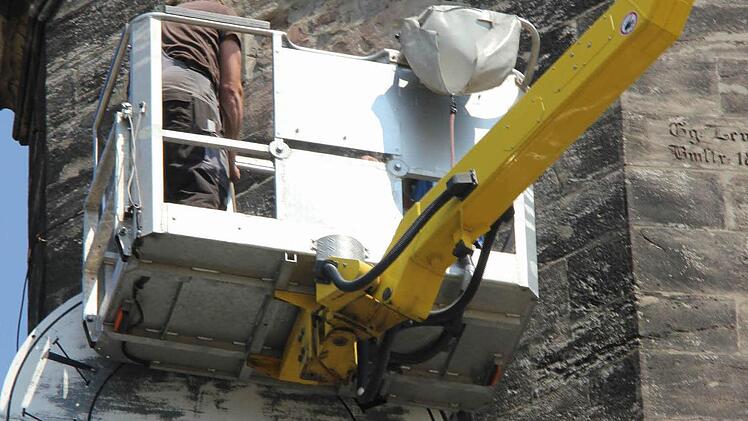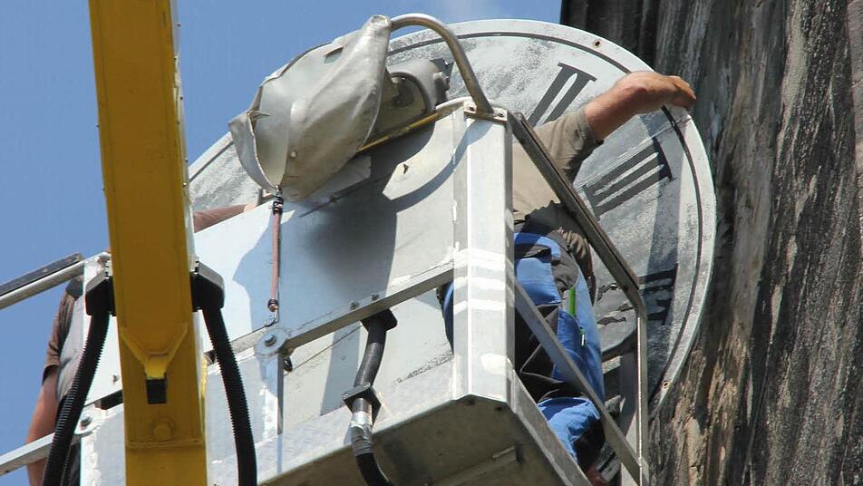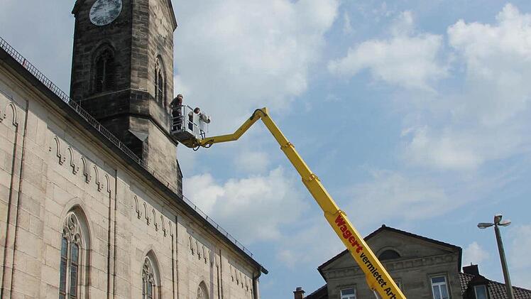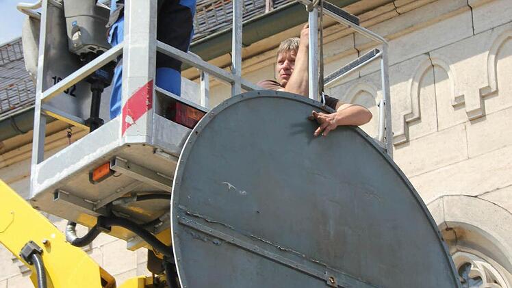 Jürgen Balbach ist Spezialist bei einer Firma für Turmuhren und Glockenbau aus Rothenburg ob der Tauber, Ralf Oßmann hievt ihn per 40-Meter-Hebebühne zu den Zifferblättern der Turmuhr der Christuskirche in Kronach. An Zifferblättern und Zeigern der Ost- und Südseite, die seit vielen Jahren der Witterung ausgesetzt sind, ist die Farbe abgeblättert. Um das restaurieren zu können, muss man in gut 30 Metern Höhe die Schrauben lösen und dann das schwere Teil zu Boden schweben lassen.