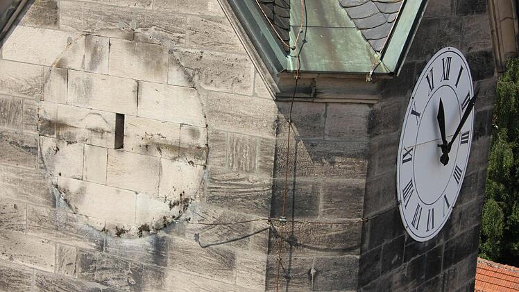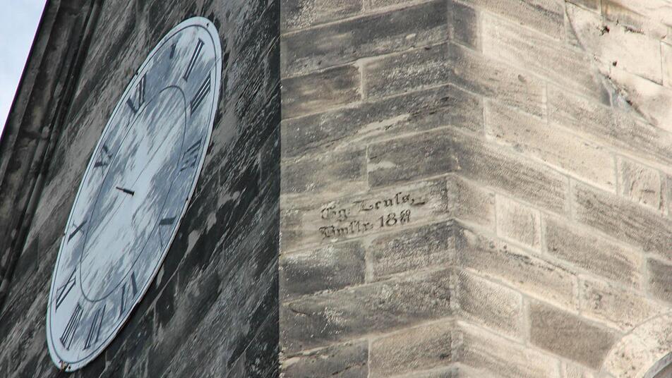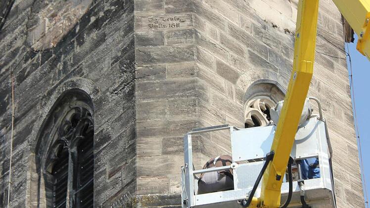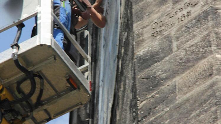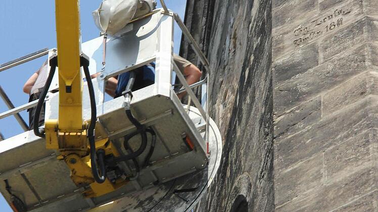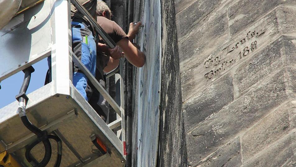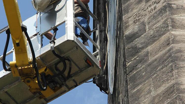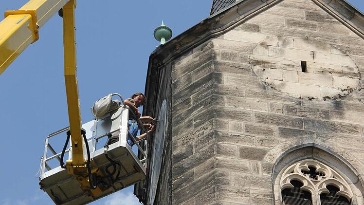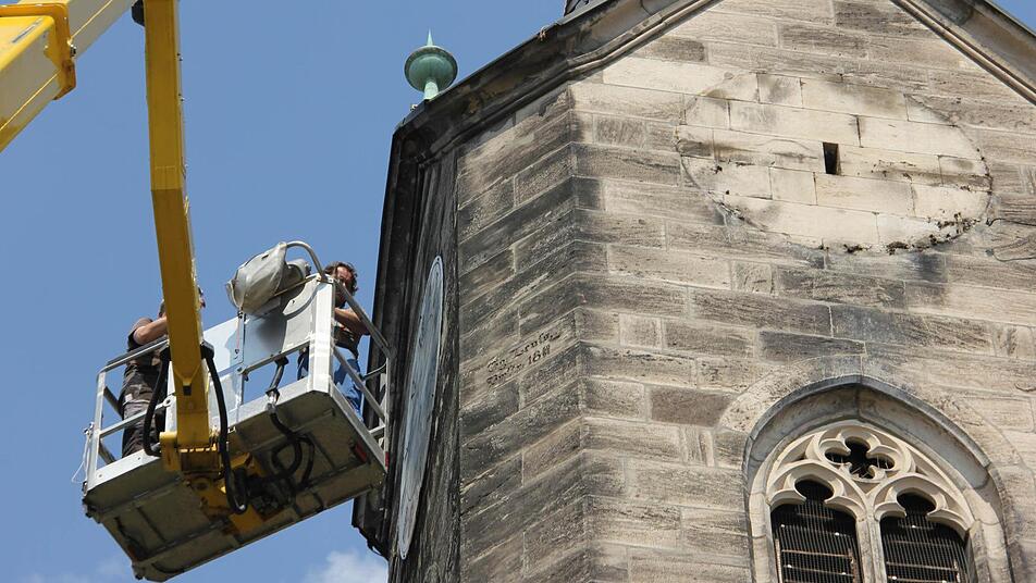 Jürgen Balbach ist Spezialist bei einer Firma für Turmuhren und Glockenbau aus Rothenburg ob der Tauber, Ralf Oßmann hievt ihn per 40-Meter-Hebebühne zu den Zifferblättern der Turmuhr der Christuskirche in Kronach. An Zifferblättern und Zeigern der Ost- und Südseite, die seit vielen Jahren der Witterung ausgesetzt sind, ist die Farbe abgeblättert. Um das restaurieren zu können, muss man in gut 30 Metern Höhe die Schrauben lösen und dann das schwere Teil zu Boden schweben lassen.