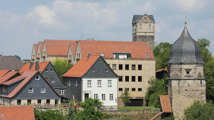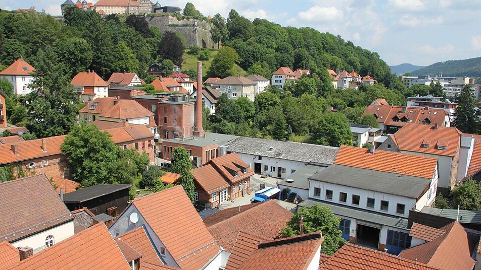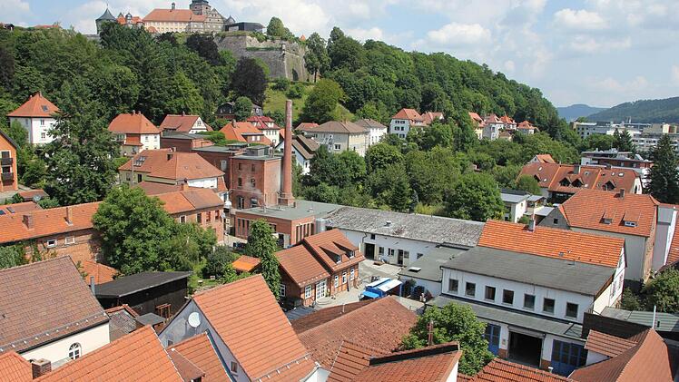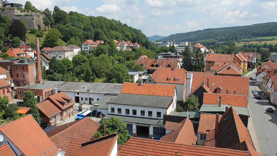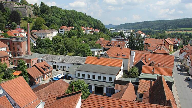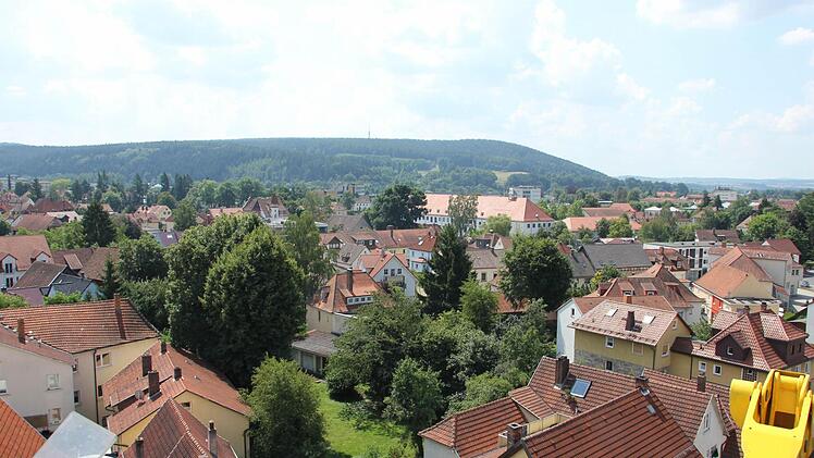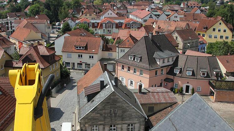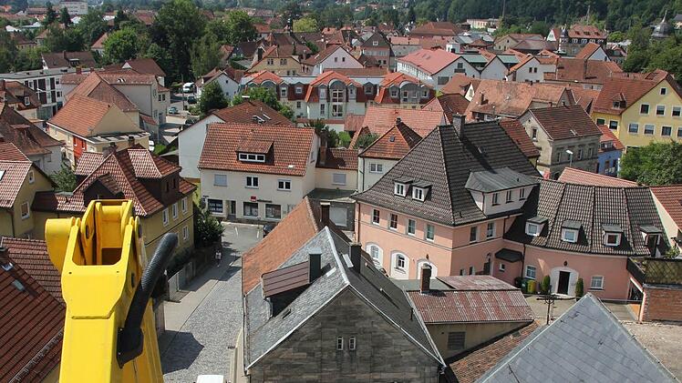 Zwei Zifferblätter der Turmuhr an der Kronacher Christuskirche werden in Stand gesetzt. Um die Teile abnehmen zu können, braucht man eine Hebebühne. Wir haben auch aus 40 Metern Höhe fotografiert und viele schöne "Luftbilder" von Kronach.