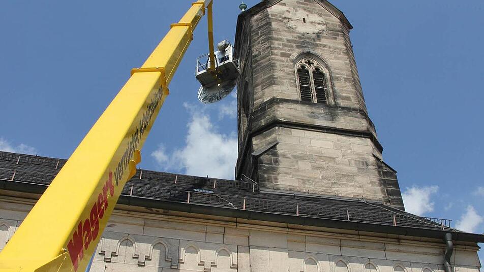 Die Passanten mit Höhenangst schauen voller Bewunderung zu zwei Männern nach oben, die in über 30 Metern Höhe über dem Dach der Kronacher Christuskirche schweben. Für die beiden, die sich das trauen, ist das ein Alltagseinsatz ohne große Anforderungen, denn sie waren schon in ganz anderen Höhen aktiv.