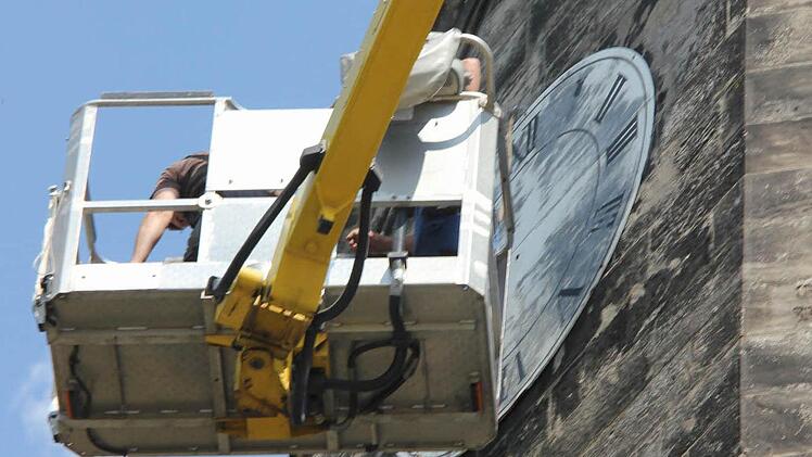 Wenn Balbachs Kollegen die beiden Scheiben und die Zeiger wieder "auf Hochglanz gebracht" haben, haben Ralf Oßmann und Jürgen Balbach den nächsten Hebebühneneinsatz. Dann geht's erneut nach oben und alles wird wieder montiert.