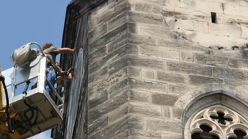 Da ist zuerst Millimeterarbeit bei Ralf Oßmann gefragt. Schließlich darf der Korb, mit dem die Männer nach oben schweben, nirgends anecken. Jürgen Balbach sichert das Zifferblatt mittels Karabinerhaken und Seil am Korb der Arbeitsbühne und dreht die Schrauben auf. Das funktioniert an der Ostseite problemlos.