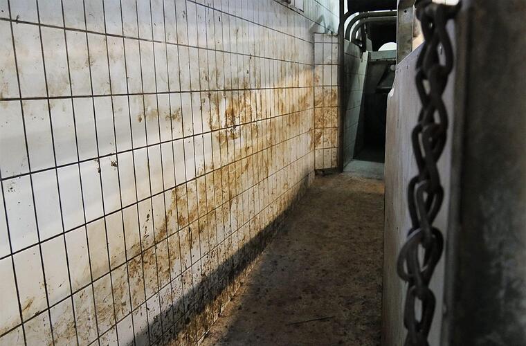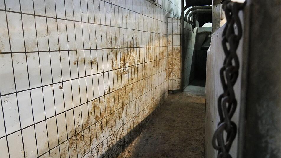 Wenn der Moment gekommen ist, werden die Tiere einzeln durch einen schmalen Gang in die Tötungsfalle geführt - entlang von weiß gekachelten Wänden, die nicht mehr weiß sind. Wird denn im Schlachthof nicht sauber gearbeitet? "Für die Tiere ist diese Umgebung ungewohnt, und schneeweiße Wände würden sie zusätzlich erschrecken", klärt Kraus auf. Darum soll es im Stall auch nicht nach Desinfektionsmittel riechen.