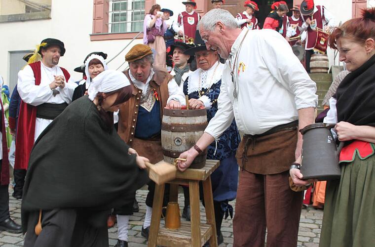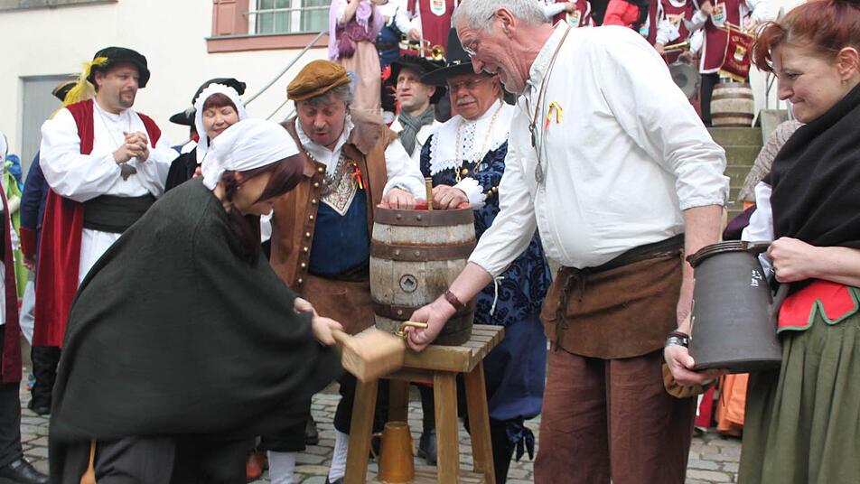 Vor dem offiziellen Teil wurden Kronachs Brunnen und Cranachs Jungbrunnen auf dem Weg zur Markthalle ins Visier genommen. Auch musste das erste Fass des Schmäußbräu angestochen werden. Diese Ehre übernahm das "tapfere Weib", Hilde Vonberg.