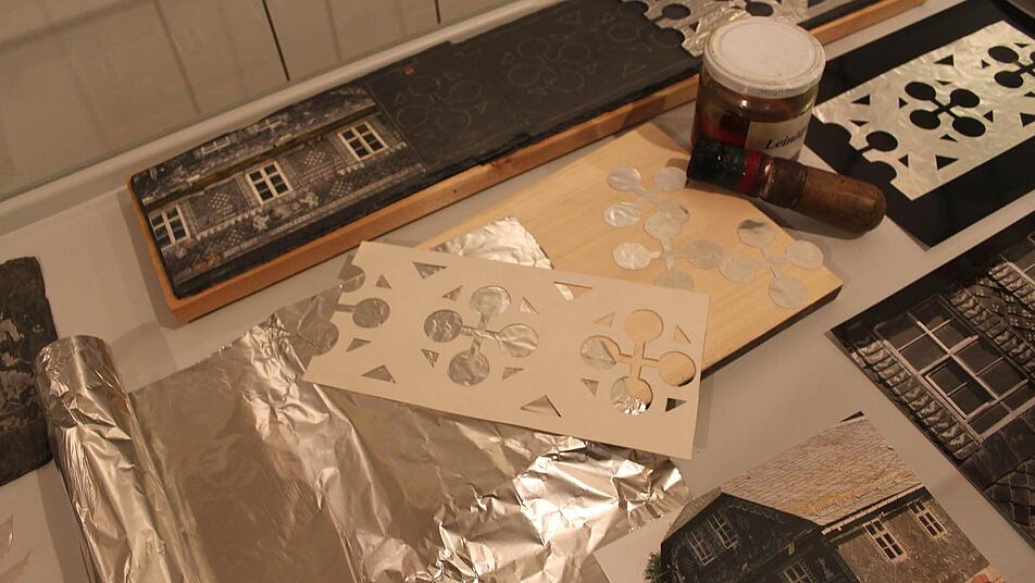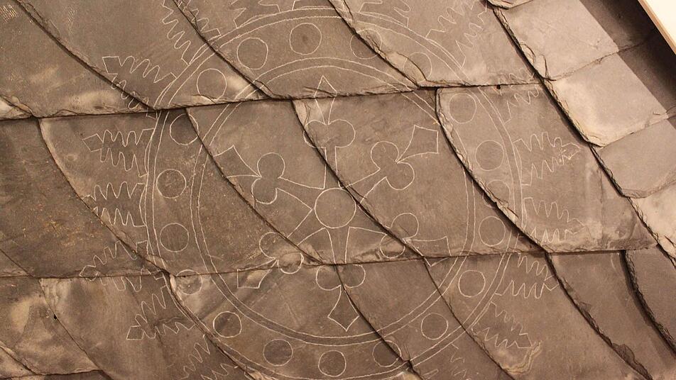 Der Aufbau, so erzählt Manja Hünlein, gestaltete sich teilweise schwierig. Alle 190 Schiefer mussten, entsprechend ihrer Nummerierung, der Reihe nach auf dem Boden ausgelegt werden. Es ging auch darum, die Maße für die Holzunterkonstruktion zu ermitteln. Dabei musste Millimeterarbeit geleistet werden, denn sonst - dabei zeigt sie auf die Ornamente - wären aus den Kreisen ovale Eier geworden.