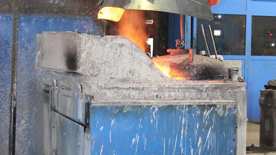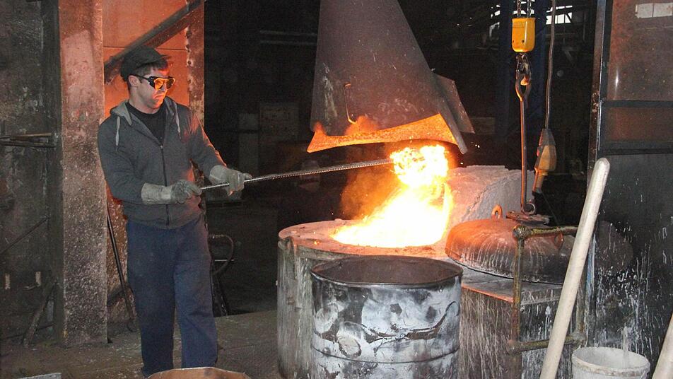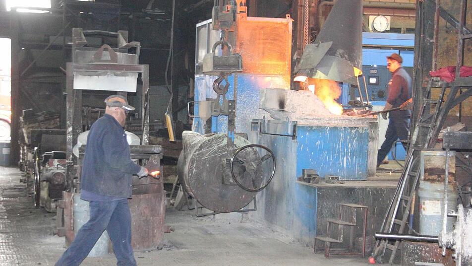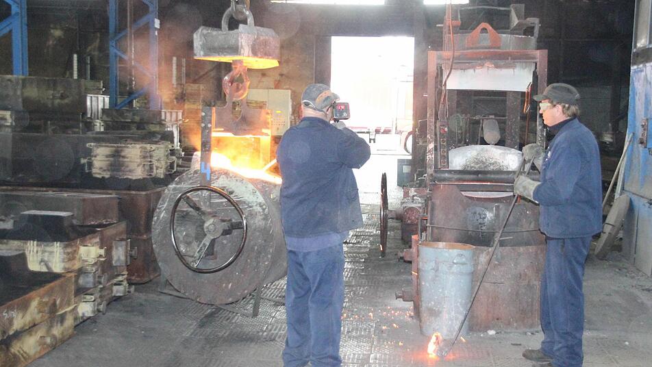 Fast 1400 Grad heißes Gusseisen läuft aus dem Behälter in die Formen, kühlt langsam ab. Es stieben nur wenige Funken. Ein Zeichen für eine gute Qualität, meinen Stefan Eber und Alexander Weimer, Geschäftsführer und technischer Leiter der Eisengießerei Kronach. Beide sind stolz auf die Leistung ihrer 40 Mitarbeiter, die nicht nur Massenware wie die Gehäuse von Elektromotoren und Pumpen herstellen.
