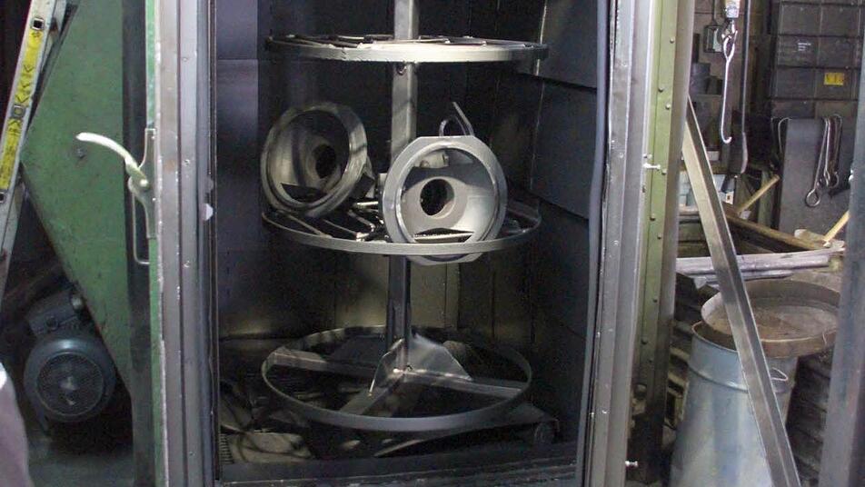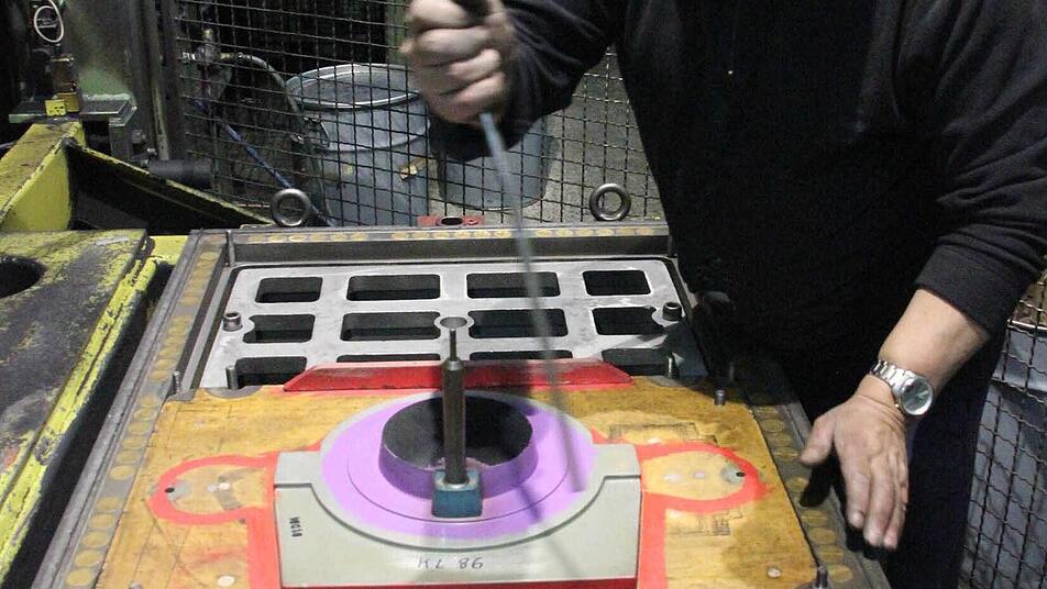 Größte Investition der Eisengießerei Kronach war die neue Kernschießmaschine. Die verdichtet den Sand für die Innenform von Rohren oder Pfosten, beispielsweise. Für innen muss man ein Material nehmen, das man aus dem erkalteten Gusseisen wieder herausnehmen kann. Der vorher durch die Maschine mit Hilfe von Chemikalien verfestigte Sand kann nach dem Gießvorgang wieder herausgeschlagen werden. Nach der Aufbereitung kann man ihn größtenteils wiederverwenden.
