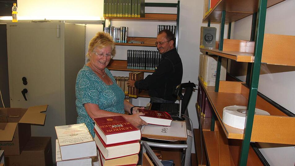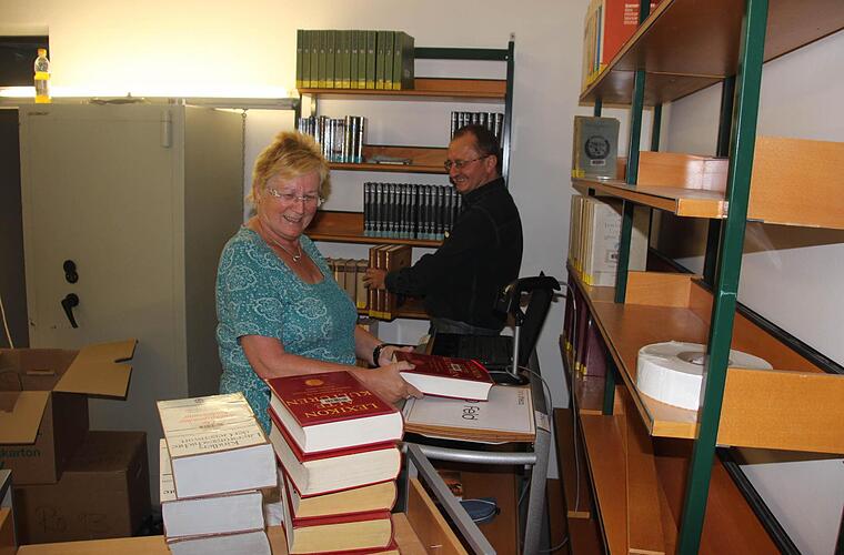 In einem Nebenraum haben Ingrid Wroblewski von der Firma "Bibliotheka" und Büchereileiter Horst Pfadenhauer eine Sysyphusarbeit vor sich.
