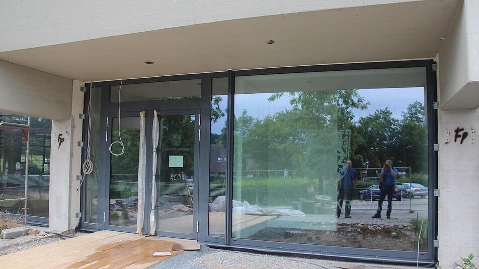 Kreiskämmerer Günther Daum führt uns durch die sanierten Räume im Schulzentrum, Start ist in der Kreisbibliothek. Auch wenn die Fassade noch hinter einem Gerüst versteckt ist, kann man erahnen, dass das Wort "Generalsanierung" ernst genommen wurde. Der Kämmerer zeigt uns die neuen Türen und Fenster. Ins Glas des Eingangsbereichs sind sogar die Worte "Kreisbibliothek" und "Landkreis Kronach" sowie das Kreiswappen eingeätzt.