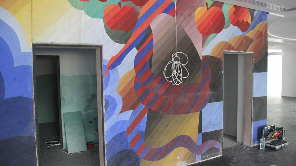 Ein Höllenlärm Peter Bechstein und Kevin Schulz machen einen Höllenlärm. Sie müssen noch eine Tür einbauen und in die Wände Löcher zum Verankern bohren. Alles wird neu in der Kreisbibliothek, genau genommen fast alles. Das Gemälde von Professor Horst Böhm auf Beton wird natürlich nicht übertüncht, das bleibt.