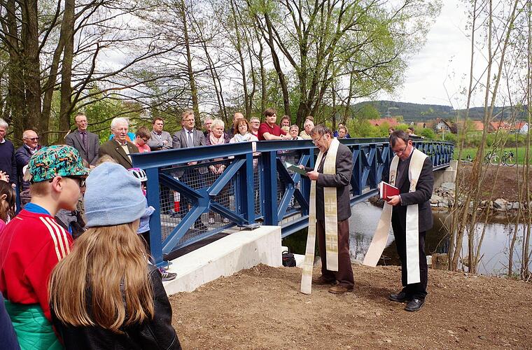 Zahlreiche Bürger, vor allem aus den Ortsteilen Reitsch, Haßlach und Stockheim, verfolgten mit großem Interesse den Weiheakt. Den Segen Gottes erflehten die beiden Pfarrer Michael Foltin und Hans-Michael Dinkel. Ein Steg, so die Geistlichen, habe eine verbindende Funktion. Mit ihm werden Umwege erspart. Mit dem Steg führten die Wege zueinander. Die Bläsergruppe der Volksschule, Leonard Buckreus, Luca Völk und Hannes Buckreus, eröffneten musikalisch mit ihren Trompeten und dem Euphonium die Zeremonie. Mit erfrischendem Gesang erfreuten außerdem die Schüler der Klasse 4a der Reitscher Volksschule unter der Leitung von Rektorin Astrid Kestel die Zuschauer.