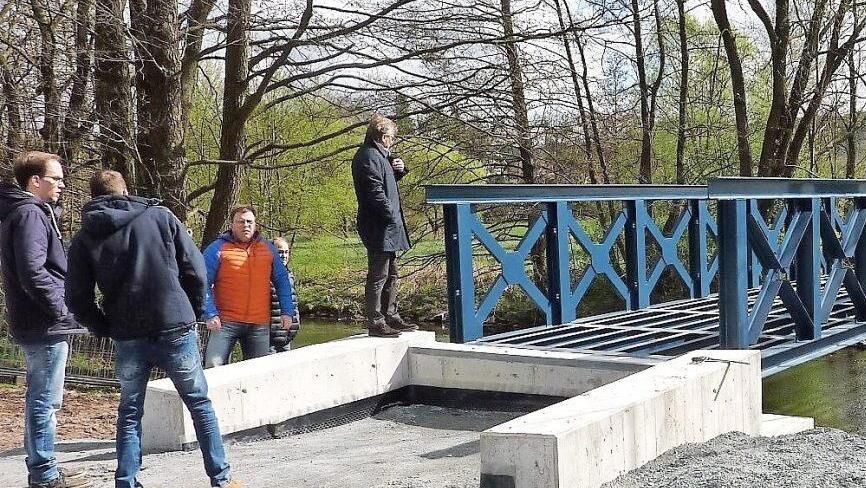Bürgermeister Rainer Detsch zeigte sich bei der Besichtigung des Engelesstegs erleichtert über den Baufortschritt, der aufgrund von Engpässen der Bauträger erheblich verzögert wurde. Schließlich sei die Brücke für die Reitscher eine wichtige Verbindung zu den Stockheimer Märkten.