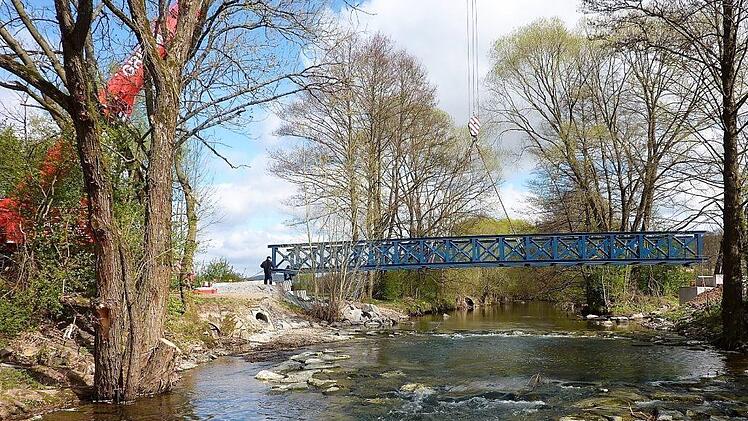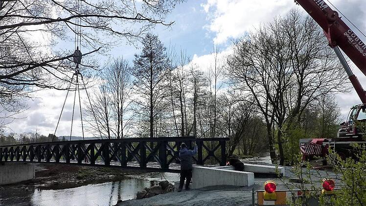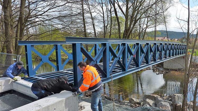 Der uralte Engelessteg, der vor allem den Ortsteil Reitsch mit dem Haßlachtal verbindet und im September vorigen Jahres abgerissen wurde, hat am Donnerstag eine 23 Meter breite Stahlkonstruktion erhalten. Ein 125-Tonnen-Kran aus Coburg hievte die zwölf Tonnen Stahl mühelos über den Haßlachfluss auf die Betonfundamente.