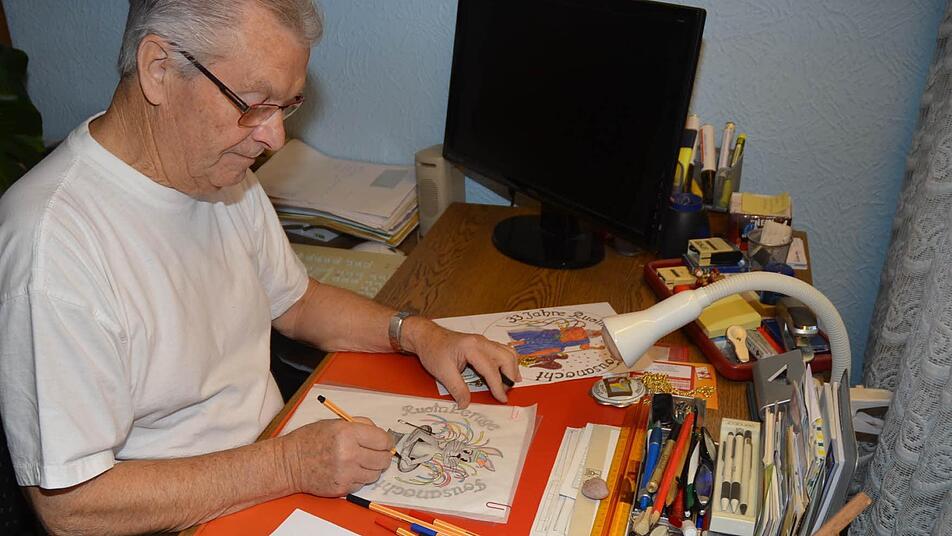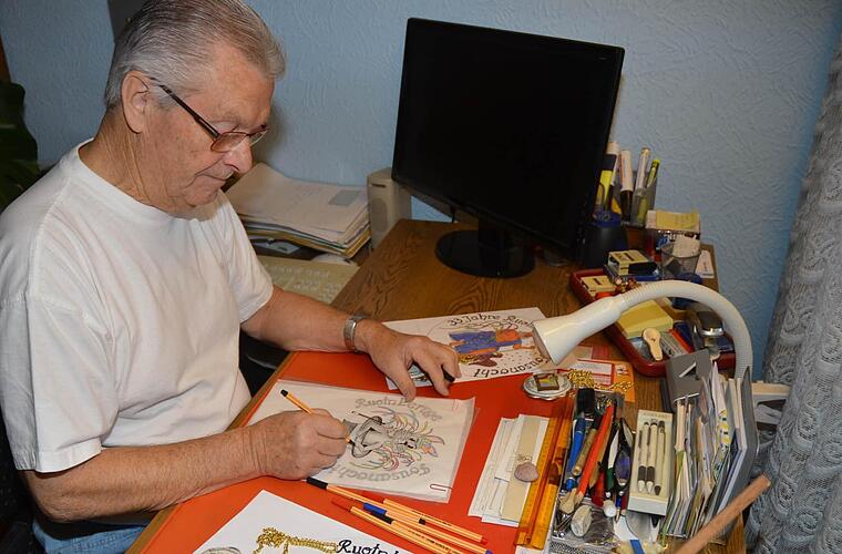 Nun schon im vierten Jahr entwirft er auch die attraktiv gestalteten Faschingsmotive und schafft für das jeweilige Faschingsmotto eine Symbolfigur. Vom Entwurf auf Pergament-Papier, mit Farbstift und Fantasie aufgetragen, beginnt der Weg bis zum attraktiven, aus Zinn und Porzellan bestehenden Faschingsorden.