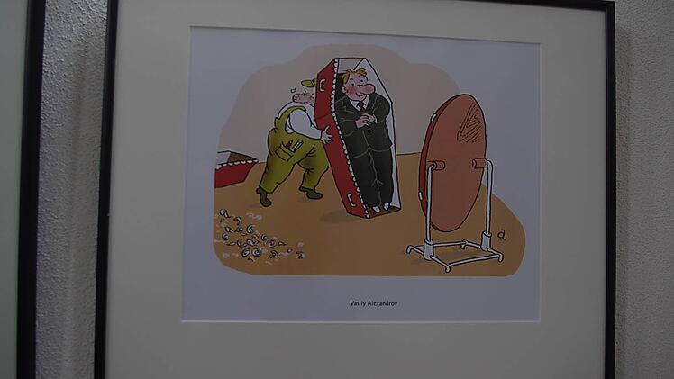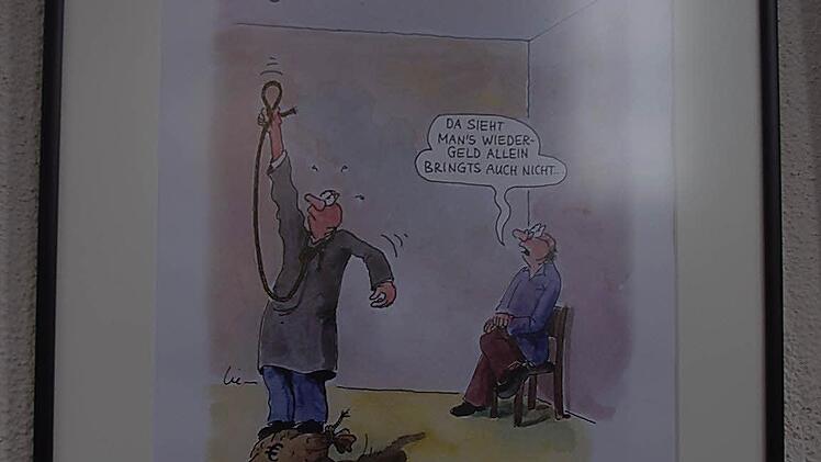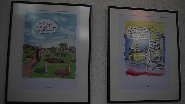 "Sie hat mir der Himmel geschickt" heißt der Titel der Ausstellung, die derzeit in der Synagoge in Kronach zu sehen ist. Die Karikaturen befassen sich mit den Themen Sterben, Tod und Trauer.