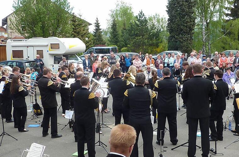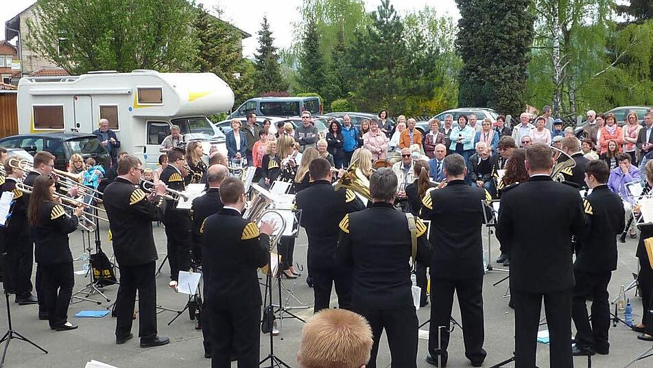 Erstmals spielte die Bergmannskapelle Stockheim ihr traditionelles Konzert an Muttertag unter der Leitung ihres neuen Dirigenten. Das Publikum vor dem BRK-Heim spendete recihlich Applaus.
