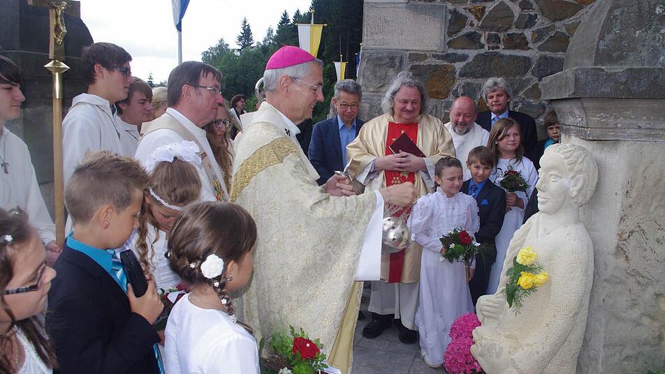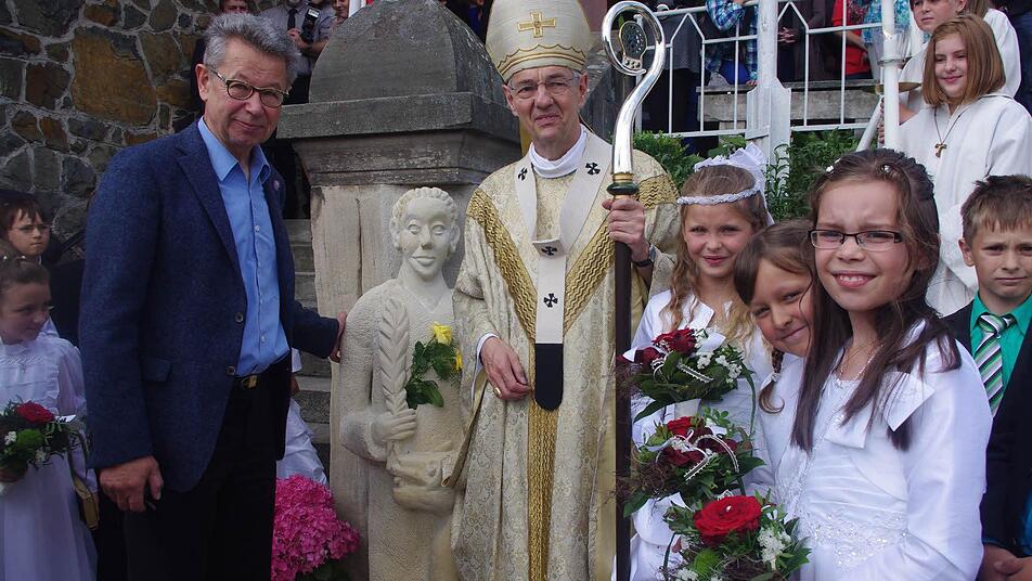 Figur des Kirchenpatrons Im Anschluss an die Heilige Messe weihte Schick die Figur des Kirchenpatrons, die von Gottfried Grau aus Grössau in Sandstein gehauen worden war und nun ihren Platz an der oberen Eingangstreppe zum Gotteshaus einnimmt. "Die Figur schaut so freundlich", stellte der Erzbischof lobend fest, nachdem Gottfried Grau sein Werk enthüllt hatte. Der Weihehandlung schloss sich ein Frühschoppen mit Unterhaltungsmusik durch den Musikverein Steinberg an.