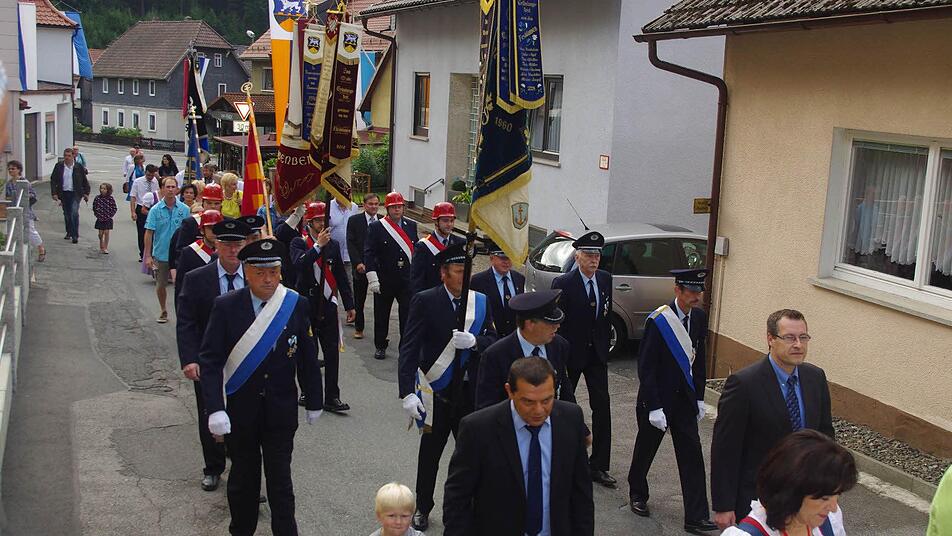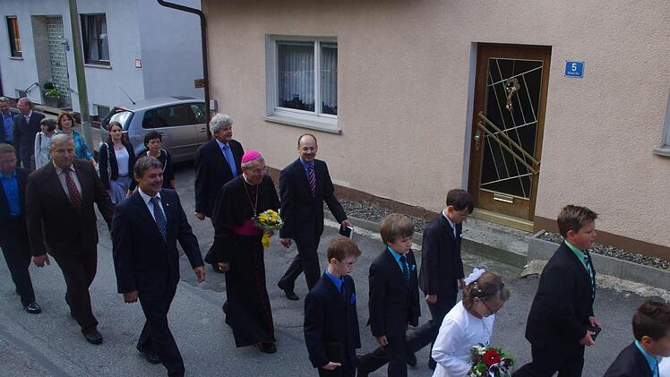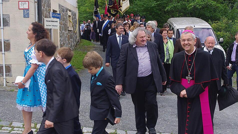 Eine Kirchenparade mit Abordnungen der örtlichen Vereine und Gremien sowie Vertreter der Politik schlängelte sich zum Gotteshaus auf dem hoch aufragenden Schlossberg. Darunter war auch ein besonderer Gast, der von einer freudig gestimmten Pfarrgemeinde herzlich empfangen wurde: Erzbischof Ludwig Schick, der sich in Steinberg zum großen Fest die Ehre gab.