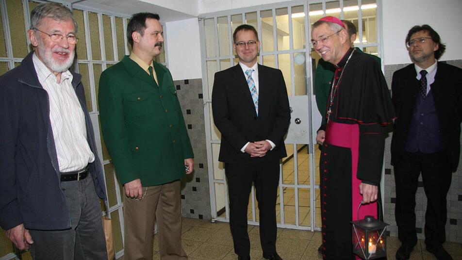 Als Erzbischof Ludwig Schick in seiner schwarzen Soutane mit der pinkfarbenen Zucchetto durch die schwere Tür in der Justizvollzugsanstalt eintrat, standen alle anderen hinter verschlossenen Türen. Niemand eilte ihm entgegen. Nicht einmal Anstaltsleiter Thomas Vogt. Denn der wartete bereits mit Kirchenmusiker Rainer Endres, mit den Justizvollzugsbeamten und mit dem JVA-Seelsorger Erwin Lohneisen auf den hohen Geistlichen im Sicherheitsbereich - hinter verschlossener Tür.
