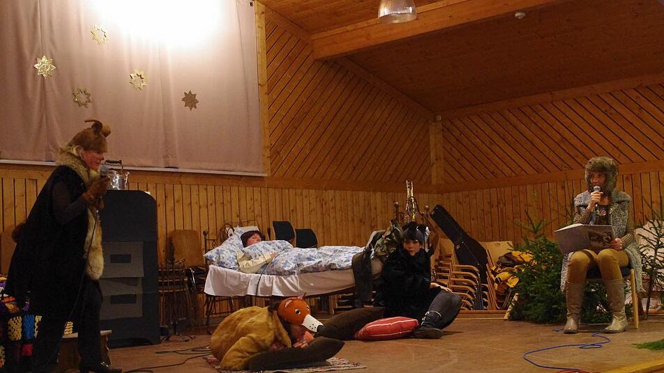 Die Bühne hatte sich dabei in ein Schlafzimmer verwandelt mit einem großen Ofen und einem kuschelig-warmen Bett für Wanja - dazu noch weitere gemütliche Schlafplätze in jeder Ecke des Raums, wo die Tiere völlig entspannt in Gegenwart der Feinde schliefen. Auf der Bühne standen in den Hauptrollen - neben Renate Hofmann als Wanja - noch ihre Kolleginnen Monika Föhrweiser (Hase), Ulla Schaller (Fuchs) sowie Yvonne Siegel (Bär). Kindergarten-Leiterin Gertrud Schubert fungierte als Erzählerin.