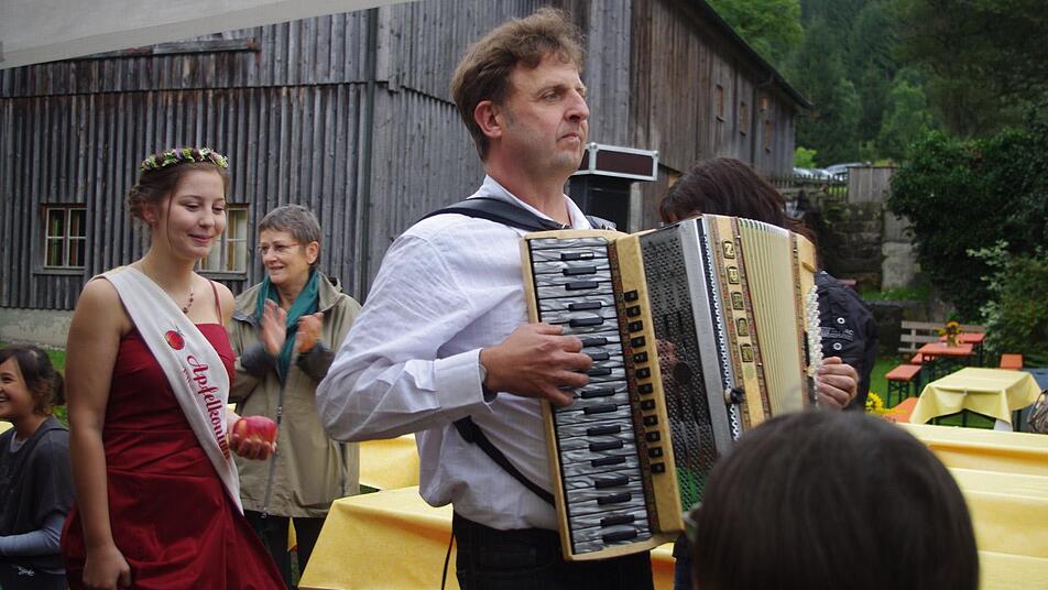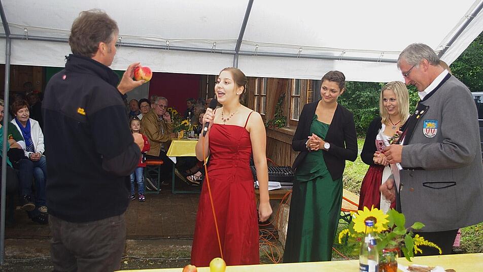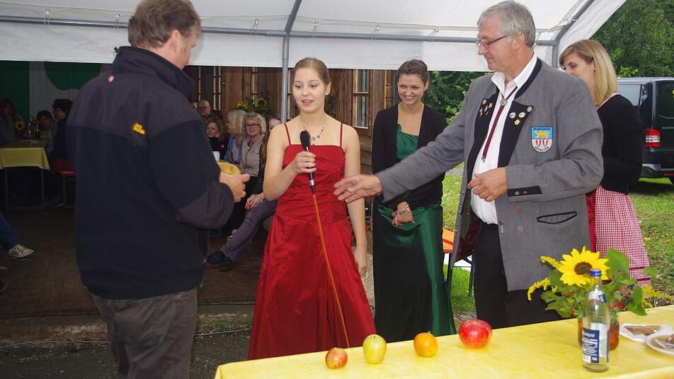 Die Frage von Klemens Löffler, Sprecher der örtlichen Vereine, ob sie die 19-Jährige als ihre neue "Botschafterin des Apfels" für die kommenden beiden Jahre wollten, war daher nur formell. Mit großem Applaus erhielt die Neue auf dem Apfelthron von ihrer Vorgängerin Julia Löffler die Insignien der Macht: die Schärpe und natürlich die Apfelkrone. Die Inthronisierung wurde gleich gebührend mit einem Apfelschnaps begossen.