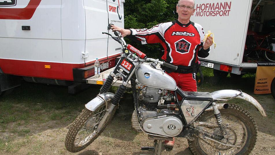 Das älteste Motorrad bei diesem Trial-Wettbewerb hatte Günter Hofmann. Er ging mit einer NSU osl an den Start - Baujahr 1950. "Es sieht gar nicht so schlecht aus", zieht er eine kurze Zwischenbilanz und beißt beherzt zur Stärkung in eine Banane. Denn gleich geht's weiter auf dem Parcours.