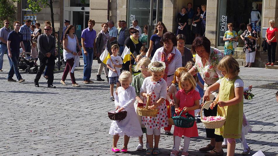 Auf dem Weg zum dritten Altar stießen auch die Kinder des Kronacher Rosenberg-Kindergartens sowie des katholischen integrativen Montessori-Kindergartens Dörfles hinzu, die Blumen streuten.