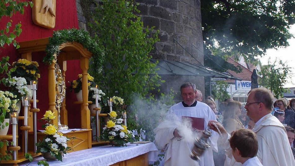 Die prachtvolle Monstranz, in deren Mitte zum Zeichen der Gegenwart Christi die Hostie gezeigt wird, wurde von Stadtpfarrer Thomas Teuchgräber durch die Straßen getragen. An vier Altären erteilte der Regionaldekan damit den Segen.