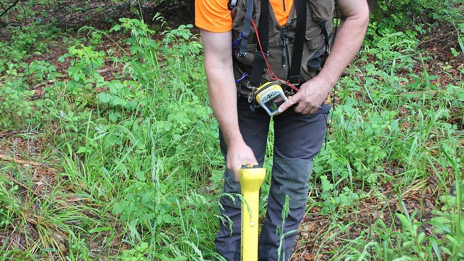 Dann spürt das Magnetsuchgerät die exakte Lage des Magneten im Boden auf. Ein Pfahl mit Abstandsmessgerät wird gesetzt. Dann wird die Veränderung des Baumbestands in drei konzentrischen Kreisen um den Pfahl - 25, 80 bzw. 400 Quadratmeter Fläche - dokumentiert, wobei außen nur die dickeren Stämme, innen auch die dünnen notiert werden. Auch Totholz wird - wenn es entsprechende Dimensionen hat - mit in die Messung aufgenommen.