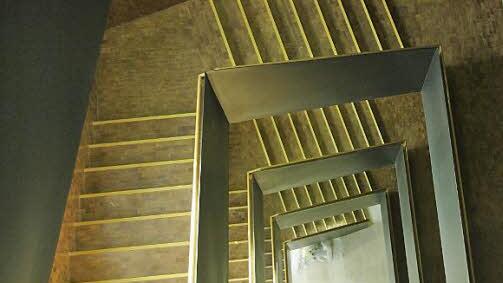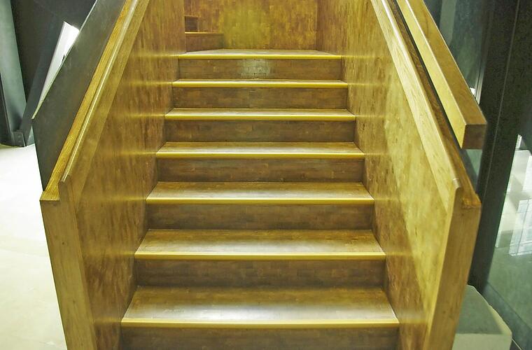 Beinahe hätte Jörg Dorsch ein drittes Mal ins Emirat fliegen müssen, denn als er bereits zu Hause war, seine Männer aber noch vor Ort mit Schleifarbeiten am Holzpflaster beschäftigt waren, erreichte ihn ein Anruf des Projektleiters Rudolf Frieden: "Jörg, Du musst sofort runterfliegen. Und bring jede Menge Schleifpapier mit. Die deutsche Eiche ist härter als gedacht und das Schleifpapier Deiner Leute verbraucht." Doch Jörg Dorsch hatte eine bessere Idee. Er pflegt Kontakte zu einer Firma in Dubai, die Schleifpapier besorgen konnte. Er orderte das Material und schickte einen Fahrer mit einem Pickup von Abu Dhabi nach Dubai, um die Lieferung abzuholen. Somit hatte sein Team keine Unterbrechung und konnte weiterarbeiten. Das Eichenholz-Pflaster des Treppenhauses der Exhibition Hall wurde geölt und ist ein echter Lichtblick. Fast zu schade für ein Treppenhaus.