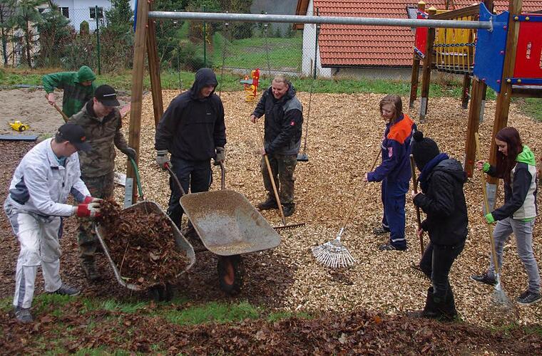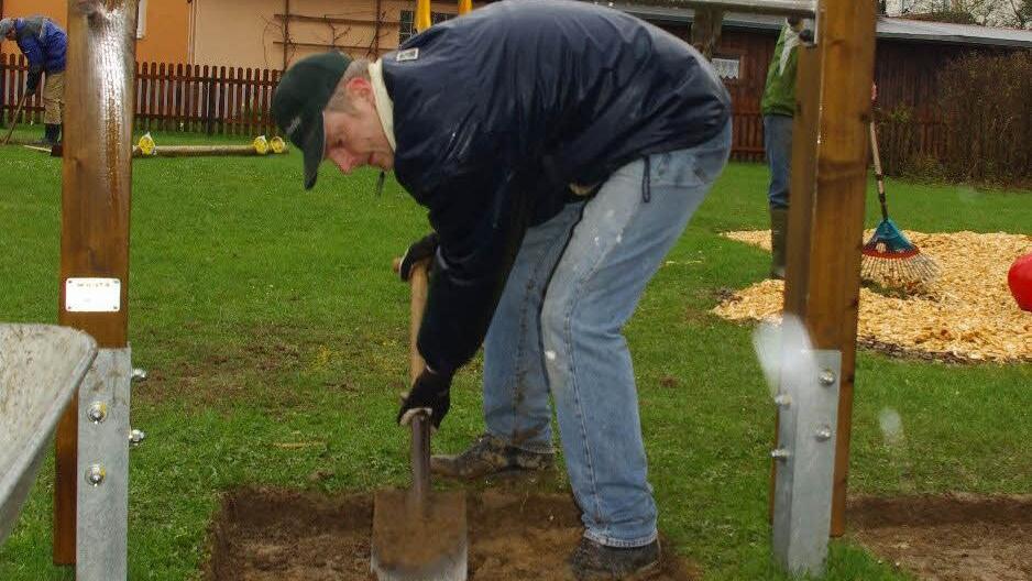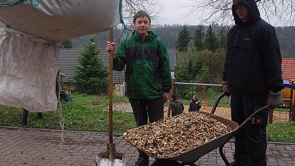 Da soll auch der Spielplatz für die Kinder in einem ordentlichen Zustand sein", so Alexander Hoderlein und seine "Mannen". Ein dickes Lob verdiente sich der zwölfjährige Tom Basler, der trotz regennasser Haare und Kleidung den Erwachsenen tüchtig zur Hand ging.