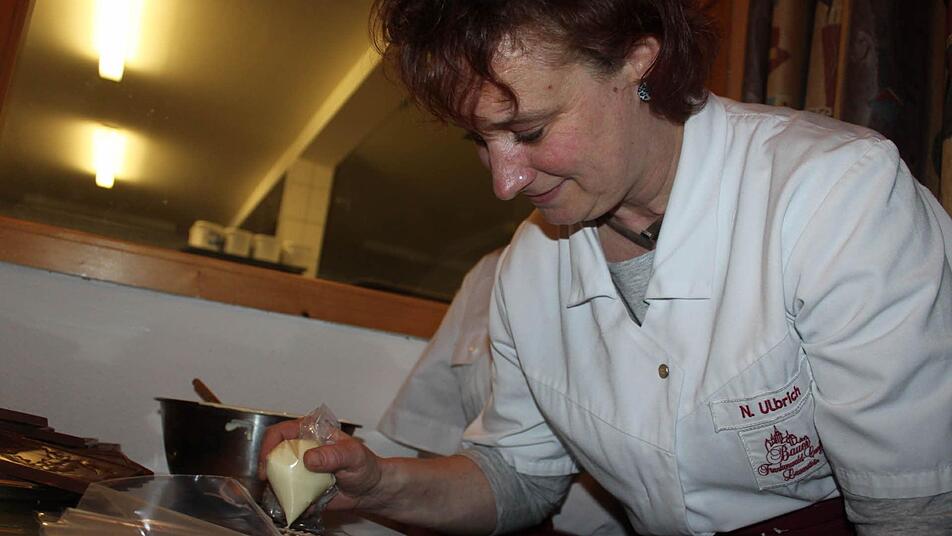 Silvia Schramm betont, dass während des gesamten Ablaufs auf die richtige Temperatur der Schokolade geachtet werden muss, um eine hochwertige Qualität zu erzielen. Rund 120 verschiedene Pralinensorten gibt es bei der Frankenwald-Confiserie.