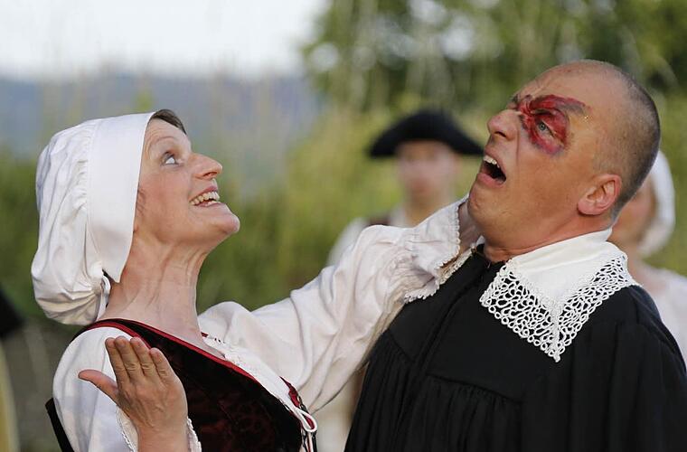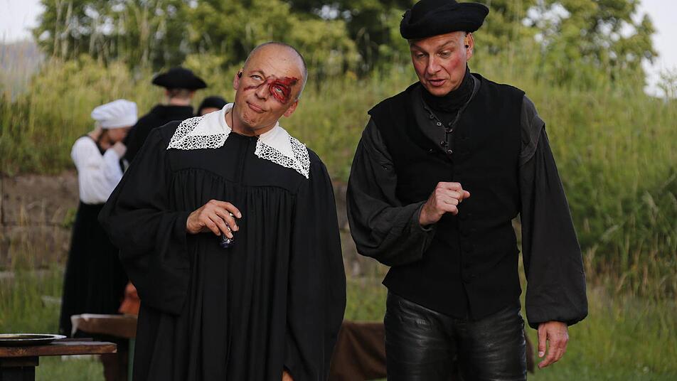Für die im dicken Kostüm des Gerichtsrats Walter bei der Hitze besonders schwitzende Heidemarie Wellmann hatte Kerstin Löw ebenfalls ein Kompliment parat. "Das ist gespieltes Schauen", lobte sie die oft langen textlosen Passagen des Gerichtsrats. Denen, die sich mit dem Gedanken tragen, die Faust-Festspiele zu besuchen, riet die Tourismus-Chefin: "Kommt, kauft Tickets, um die Faust-Festspiele voranzubringen!"