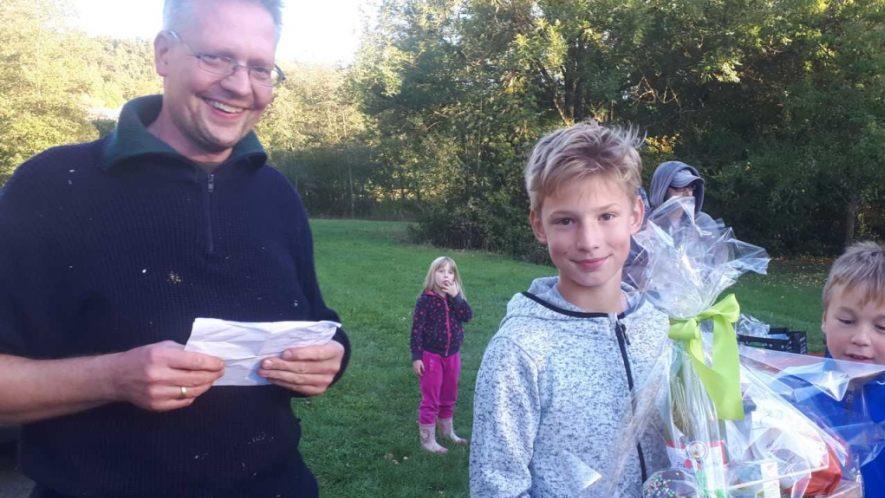 Doch wer hatte nun die größte Menge an Äpfeln? Die Spannung stieg, als einer nach dem anderen zum Wiegen an die Keltereiwaage kam. Insgesamt hatten die Kinder 5,5 Zentner - also 275 Kilo - in dieser kurzen Zeit aufgelesen. Über den ersten Platz in ihrer Altersklasse freuen konnten sich Emely Oßmann (0 - 5 Jahre) mit 11 Kilo, Florian Fischer (6 - 8 Jahre) mit 20 Kilo und Jannik Bayer (9 - 14 Jahre) mit 21 Kilo Äpfeln freuen. Alle drei erhielten von Matthias Fischer ein "apfeliges" Geschenk, bestehend aus einem Apfelrezeptbuch, einem Apfelspalter, hausgemachtem Apfelsaft, Apfelchips, Apfelringen und einem Schokoapfel.