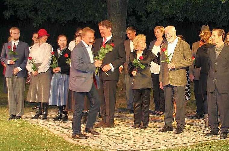 Nach dem Schlussapplaus des "Besuchs der alten Dame" übergab Bürgermeister Wolfgang Beiergrößlein an die Schauspieler Blumen.