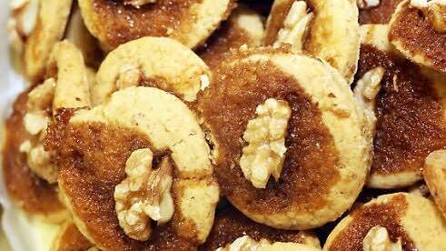 Zum Verzieren:Auf jedes Plätzchen einen Klecks Rübensirup geben und jeweils eine Walnusshälfte oben drauf setzen.