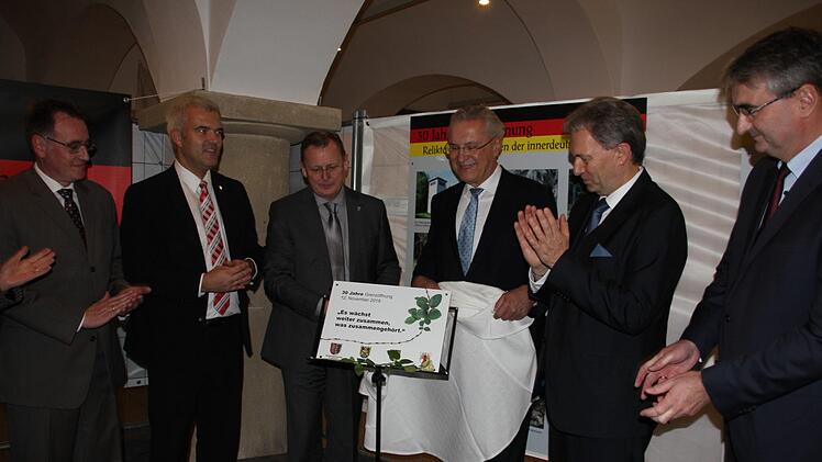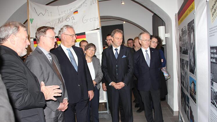 Beim Rundgang durch die Ausstellung wurden wohl bei den meisten Teilnehmern Erinnerungen wach. Ihm sei es, genauso wie damals, den Rücken heruntergelaufen, meinte Altlandrat Werner Schnappauf. Damals habe er zusammen mit der Vorsitzenden des Rates des Kreises Saalfeld, Edith Ludwig, am Falkenstein das Band durchschnitten. "Das war so ergreifend!"