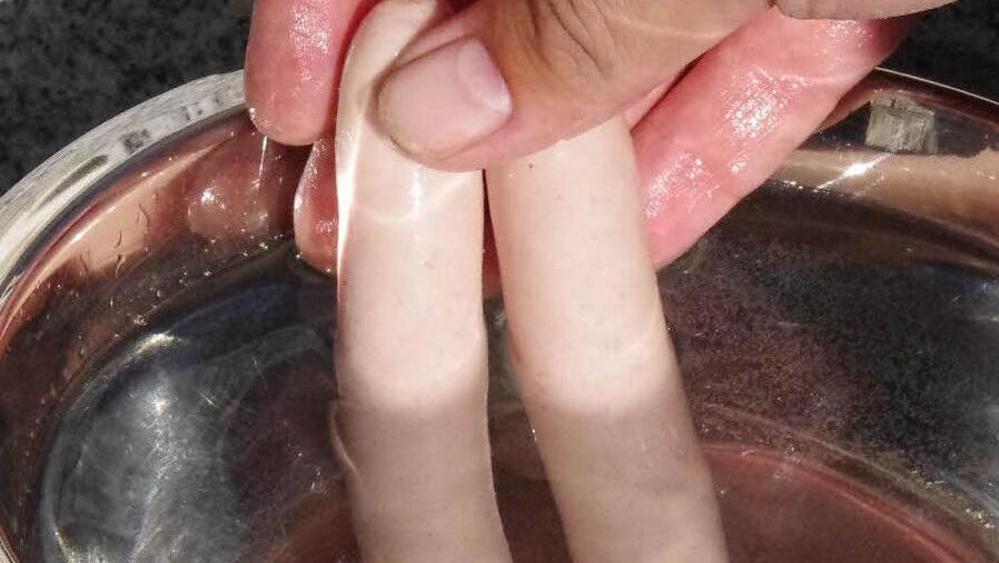 Durchgebraten: Um zu erfahren, wie sich ein durchgebratenes Steak anfühlt, muss man den Daumen an die Spitze des kleinen Fingers legen und den Drucktest durchführen. Fühlt sich das Grillfleisch auch so an, ist es "durch" oder "well done", wie der Engländer sagt (Kerntemperatur über 68 Grad).
