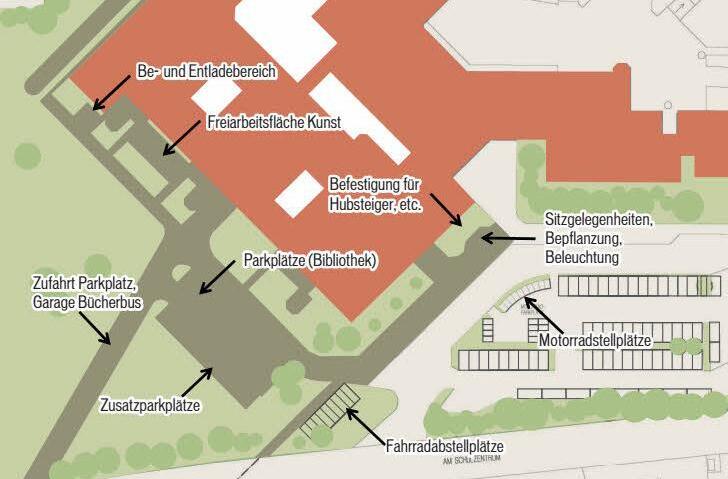 Ferner werde man südwestlich der Bibliothek zwei Parkplatzreihen für Pkws errichten, Motorradparkplätze sowie auch Fahrradparkplätze und ein grünes Klassenzimmer sollen die Außenanlagen vervollständigen. Hierzu meinte der Landrat: "Wir wollen die Außenanlagen so gestalten, dass sie die nächsten 20 Jahre den Ansprüchen gerecht werden, so wie uns dies bei der Innensanierung gelungen ist, wollen wir auch die Außenanlagen zukunftsorientiert anlegen und einen großen Wurf wagen, um Schülern und Lehrern gerecht zu werden. Dazu gehört auch die Anlage eines grünen Klassenzimmers, das naturnahen Unterricht ermöglicht." Dass aber nicht alles Wünschenswerte auch realisierbar sei, zeigten Anträge auf Annexmaßnahmen.
