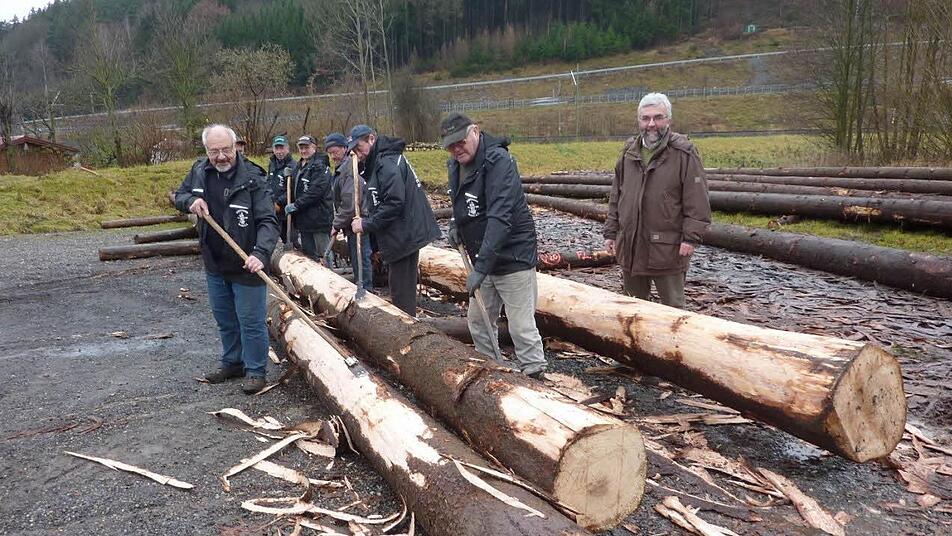 Der Forstbetrieb Rothenkirchen ließ den Flößern für die nächste Saison eine tonnenschwere Spende zukommen. Dann mussten die über 40 Fichtenstämme geschält werden.