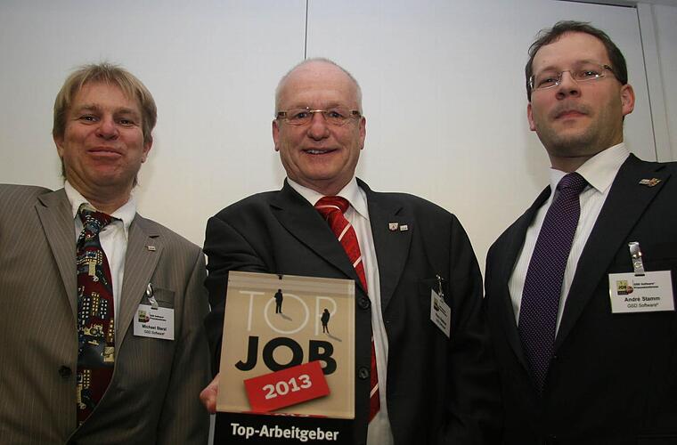 Die Geschäftsführer Hans Rebhan, Michael Sterzl und André Stamm freuen sich sehr über die Auszeichnung durch "compamedia". Bei einer Pressekonferenz gestern lobte Mitarbeiterin Ann-Cathrin Beez, die IT-Systemkauffrau bei GSD gelernt hat, das "super-familiäre" Klima. "Fast alle Azubis werden übernommen. Und ich leite inzwischen die Warenwirtschaftsschulungen. Das ist sehr spannend. Wenn es so weitergeht, dann werde ich auch ein GSD-Urgestein", hofft die Reitscherin.