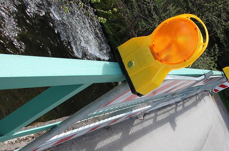 Gelbe Warnlampen, rot-weiße Metallabsperrungen - an der Gundelsdorfer Brücke über die Haßlach herrscht Baustellen-Flair. Doch hierbei handelt es sich nicht um eine Absperrung für Bauarbeiten, sondern um provisorische Sicherungsmaßnahmen. Am Fuß des eigentlichen Brückengeländers weist beispielsweise das bröckelnde Material auffällig darauf hin, dass dieses Bauwerk seine besten Tage weit hinter sich hat.